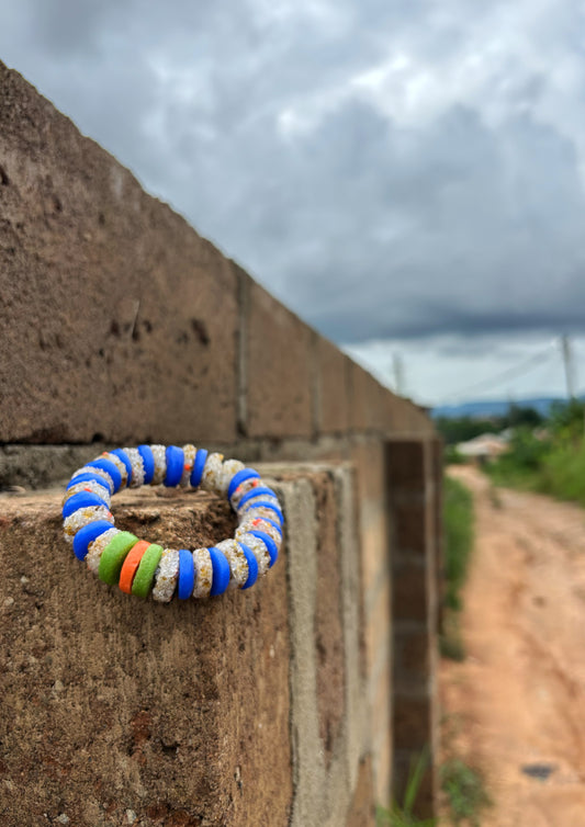 This collection of bracelets is an ongoing project Toby started on the weekends while working for a garment manufacturer in Ghana. He has handmade each piece, not following any traditional combinations of colour or pattern, but making his own interpretation based on the beads he has hand-picked.