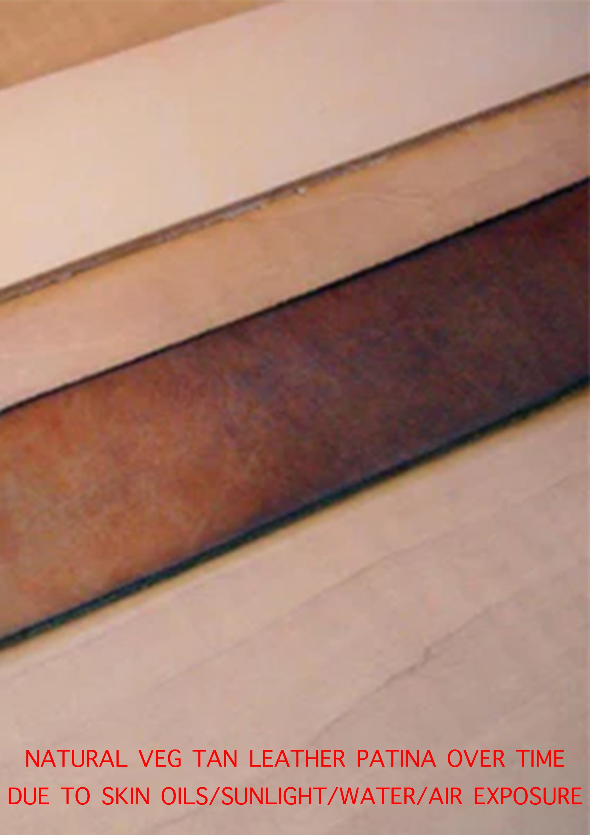 The natural vegetable tanned leather, although originally pale, will develop an incredible patina with use and exposure to skin oils, sunlight, water and air. It will eventually be a rich dark brown.